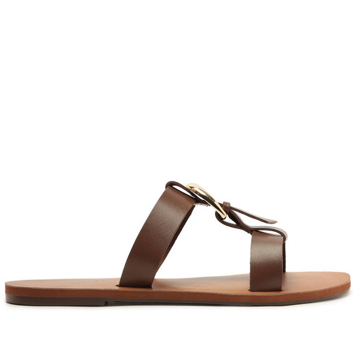 Rasteira com detalhe em fivela, na cor marrom. O modelo com shape slim possui sola rasteira flat emborrachada, com leve saltinho traseiro. Com biqueira arredondada, traz cabedal com design imponente com uma tira média sobre os dedos, conectada na tira central por maxi fivela metálica, que se une à tira sobre o peito do pé. Aberta atrás, apresenta palmilha nude, com assinatura Anacapri.
