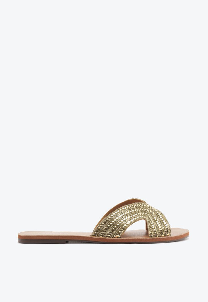 Rasteira glam com aplicação de strass, na cor dourada. O modelo, que lembra um slider, possui cabedal com recorte imponente vazado: duas tiras largas em manta de brilho com strass, aplicadas sobre a gáspea. Aberta, de bico arredondado, possui solado emborrachado com leve saltinho e palmilha marrom, com assinatura Anacapri. A rasteirinha deixa todo o pé à mostra.