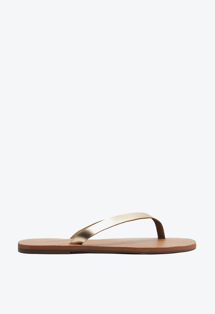 Rasteira slim de couro com tira única, na cor dourada. O modelo possui solado rasteiro emborrachado com leve saltinho traseiro e biqueira arredondada. Traz cabedal com tira central em couro que passa entre os dedos e segue pelas laterais. Com palmilha comfy nude e assinatura Anacapri.