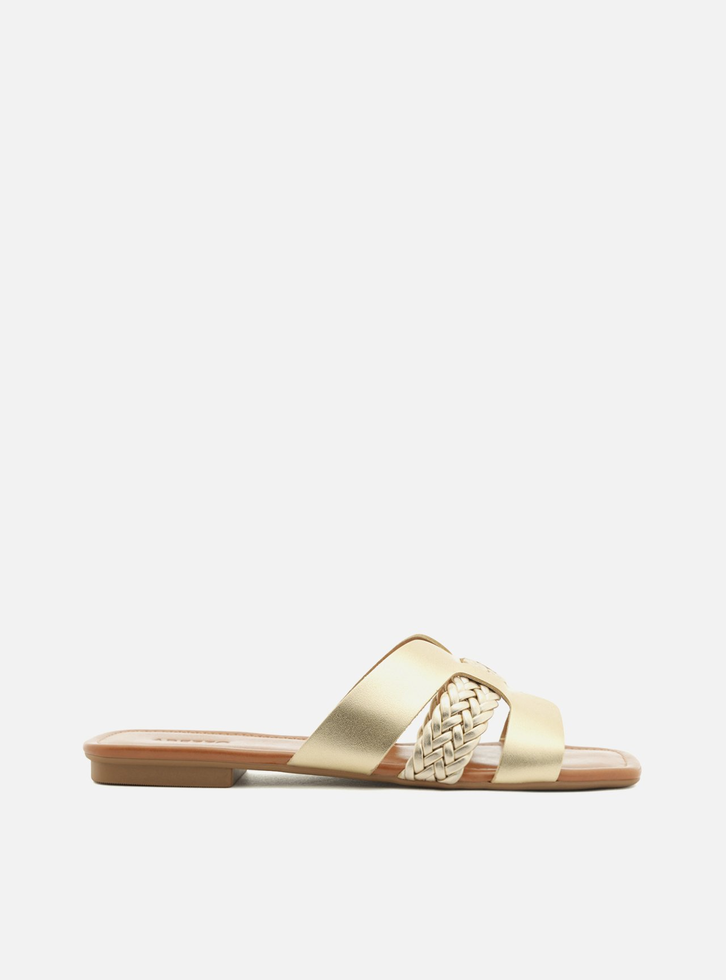 Rasteira Dourada. O modelo tem sola flat e bico quadrado. Traz cabedal em tiras encaixadas. Aberta, a sandália exibe todo o pé.