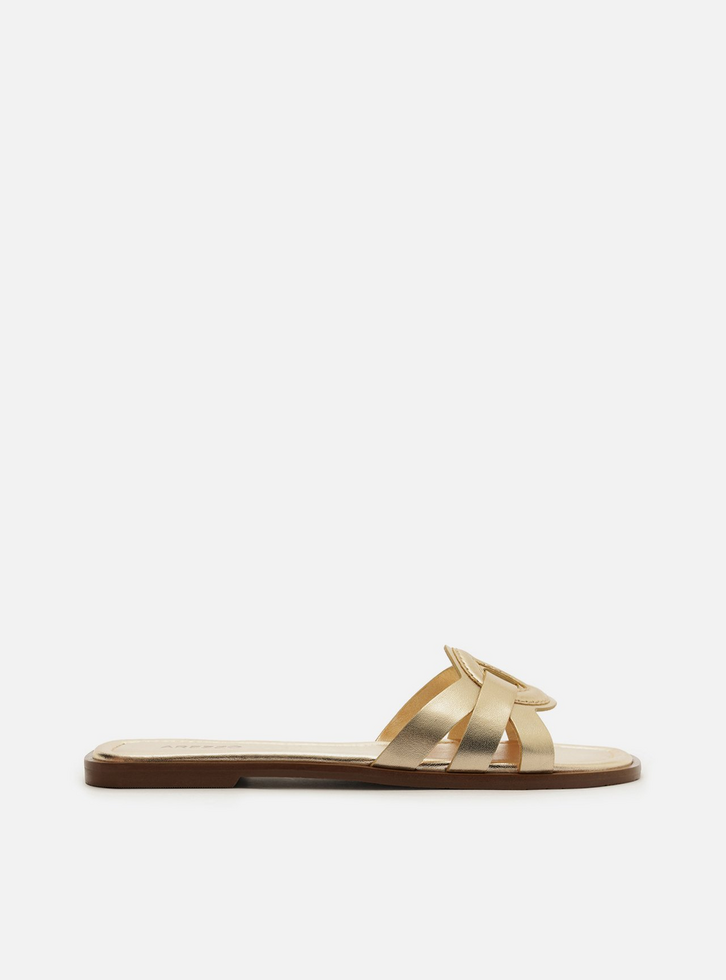 Sandália rasteira feminina dourada em couro. O sapato tem sola flat e formato quadrado na ponta. Traz cabedal formado por tiras largas entrelaçadas, com aplicação frontal em couro em formato circular e pesponto contrastante. Com palmilha marrom lisa e inscrição do nome da marca. Aberta, exibe todo o pé.