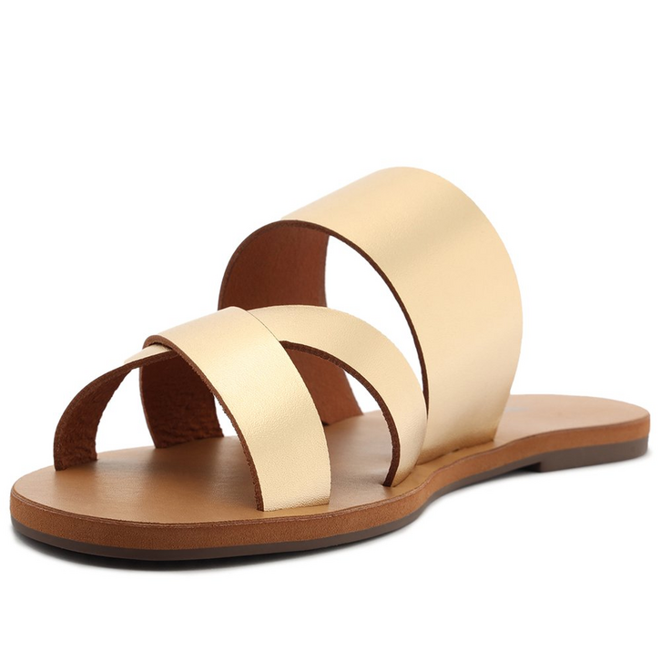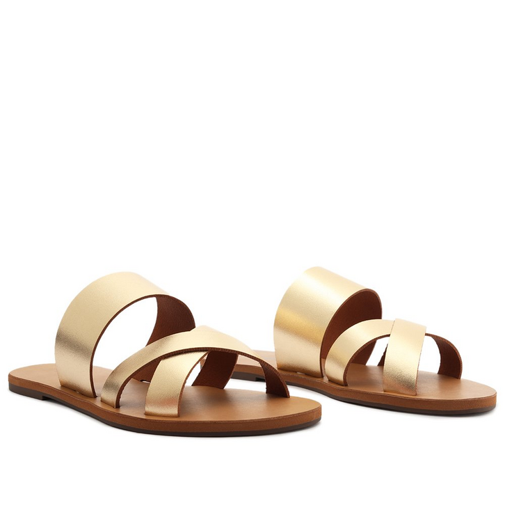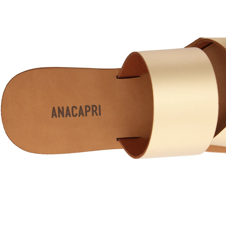 Rasteira em couro com tira tripla. Na cor dourada, possui duas faixas cruzadas finas sobre os dedos, além de uma tira larga no peito do pé. Tem solado marrom com aplicação do nome ANACAPRI na altura do calcanhar.