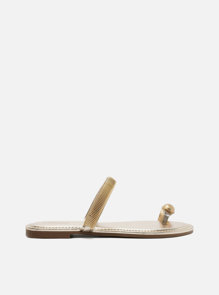 Sandália feminina dourada. O sapato tem sola rasteira flat e formato arredondado na ponta. Traz tira na parte superior do pé com aplicação metálica texturizada e tira dedeira com detalhe em metal dourado orgânico e escovado. Com palmilha dourada e inscrição do nome da marca. A sandália exibe todo o pé.
