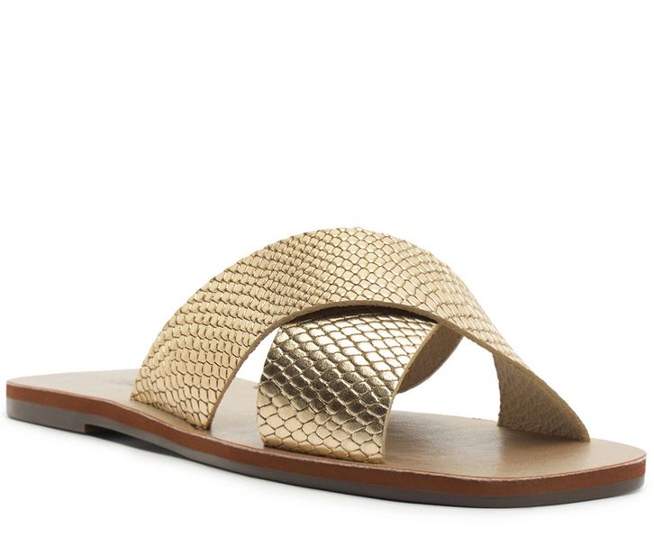 Rasteira em couro, tiras largas cruzadas com textura, na cor dourada. O modelo possui solado rasteiro emborrachado, com leve saltinho traseiro e biqueira arredondada. Estilo com cabedal de duas tiras largas cruzadas com textura snake sobre os dedos e no peito de pé, abertas atrás. Traz palmilha na cor da peça, com assinatura Anacapri. Aberta, a rasteirinha deixa os dedos e calcanhar totalmente à mostra.