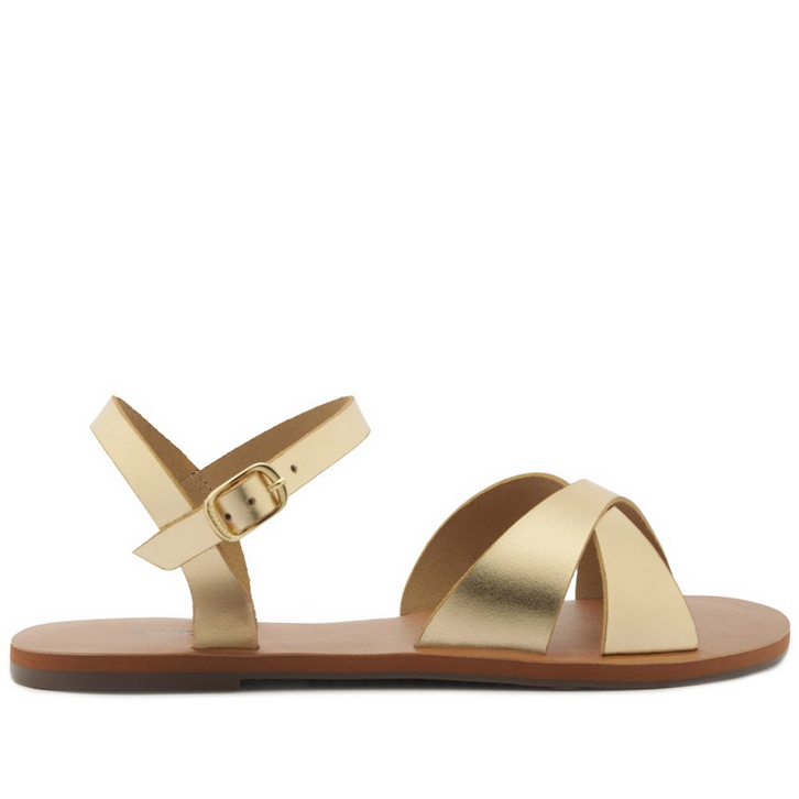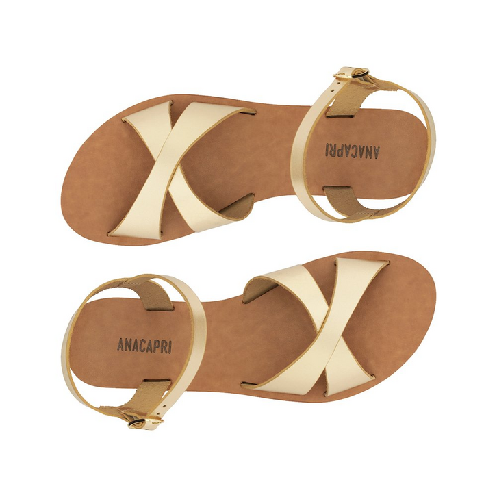 Rasteira Gaia Couro Dourada. Apresenta cabedal com duas tiras largas cruzadas sobre o peito de pé. O modelo possui biqueira redonda e soladinho flat anatômico, com assinatura Anacapri. Com tira que contorna o calcanhar, o fechamento é por fivela regulável no tornozelo. Leve e confortável, traz frescor no calce, exibe dedos e laterais. Dica de amiga: para esse modelo, recomendamos a compra de um tamanho maior do que a sua numerção convencional.