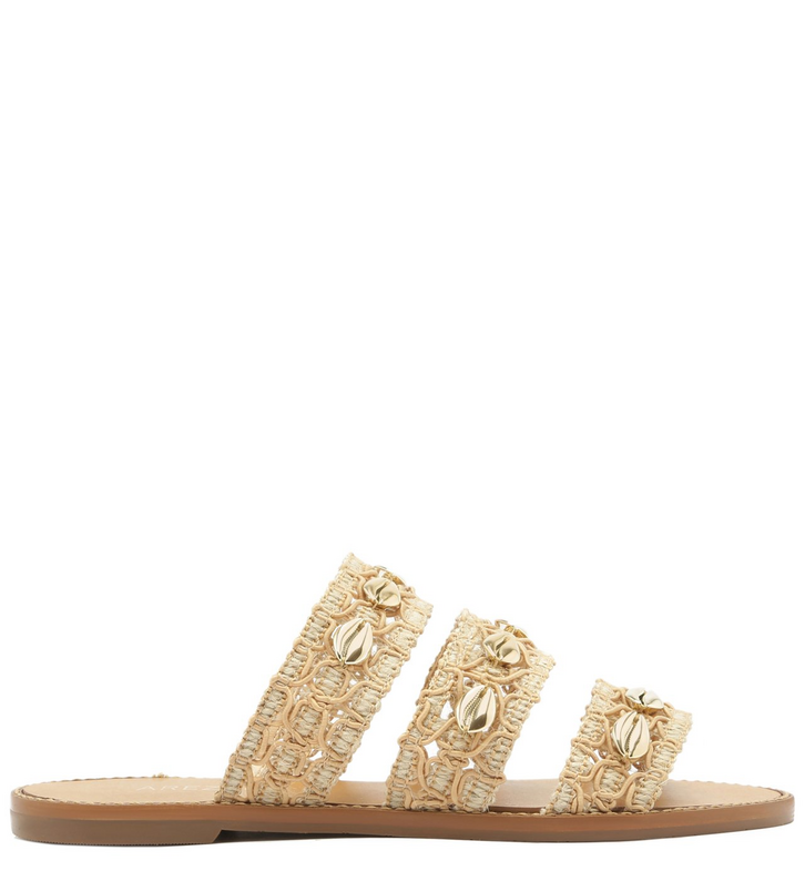 Sandália rasteira com três tiras largas, espaçadas, em juta trançada e com aplicação de búzios metálicos. Com bico redondo e palmilha marrom, deixa dedos e calcanhar à mostra. Porque Apostar /Super trend, a rasteira aposta na juta e na aplicação de búzios, criando um visual fresco e despojado. Combine com vestidos em tecidos fluidos, cores terrosas e acessórios em madeira. Bolsas tiracolo em material natural fazem o duo perfeito!