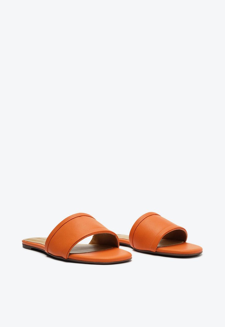 Rasteira flat na cor laranja deserto. A gáspea tem uma tira larga sobre o peito do pé com duas faixas no acabamento. O modelo tem bico quadrado e palmilha com nome da marca. Deixa dedos e calcanhar à mostra.