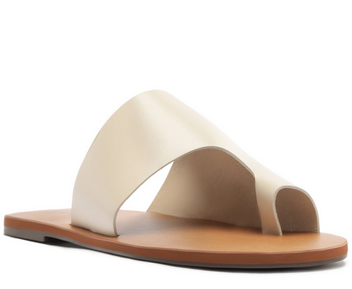 Rasteira em couro, na cor bege. O modelo flat possui solado rasteiro emborrachado, com leve saltinho traseiro. Apresenta cabedal em tira única mais larga: com design de recorte que cobre parte do pé e detalhe imponente que separa os dedos. De biqueira arredondada, traz palmilha marrom, com assinatura Anacapri. Aberta, o modelo deixa parte do pé à mostra.