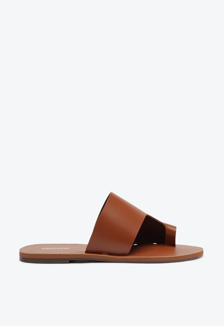 Rasteira Lisa em couro, na cor marrom. O modelo flat possui solado rasteiro emborrachado com leve saltinho traseiro. Apresenta cabedal em tira única mais larga: com design de recorte que cobre parte do pé e detalhe imponente que separa os dedos. De biqueira redonda, traz palmilha de mesmo tom, com assinatura Anacapri. Aberta, o modelo deixa parte do pé à mostra.