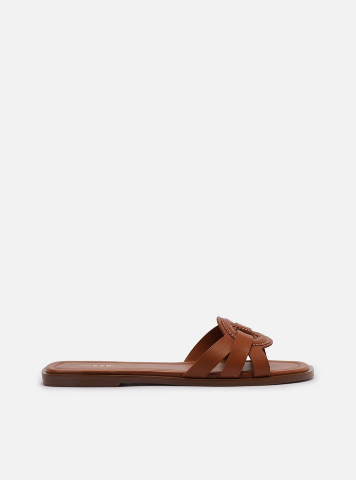 Sandália rasteira feminina marrom em couro. O sapato tem sola flat e formato quadrado na ponta. Traz cabedal formado por tiras largas entrelaçadas, com aplicação frontal em couro em formato circular e pesponto contrastante. Com palmilha marrom lisa e inscrição do nome da marca. Aberta, exibe todo o pé.