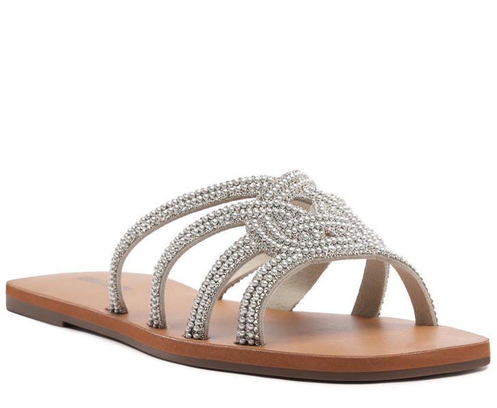 Rasteira glam de tiras entrelaçadas, na cor prateada. O modelo - estilo flat - de material similar ao couro, traz biqueira moderna quadrada e possui solado emborrachado, com leve saltinho traseiro. Possui cabedal com tiras sobre os dedos, que se cruzam e se conectam ao centro, com design de elo. Com detalhe glam nas tiras, em manta suede brilhosa. Com palmilha comfy e assinatura Anacapri em carimbo metálico.