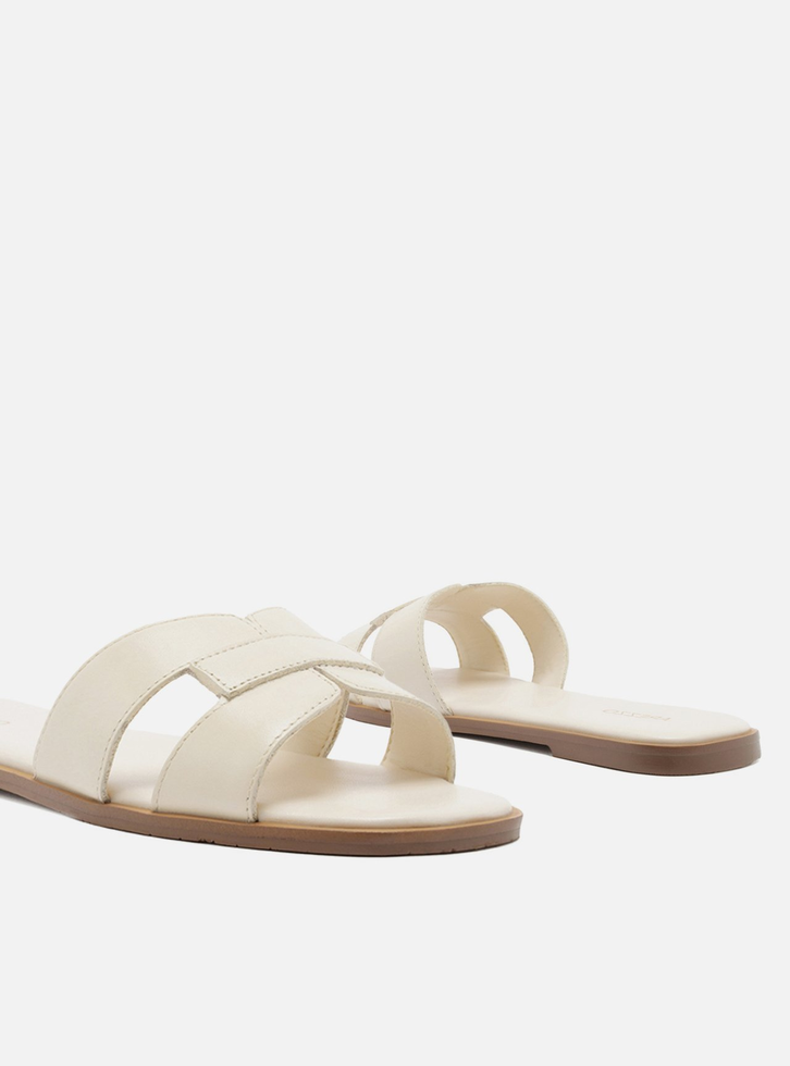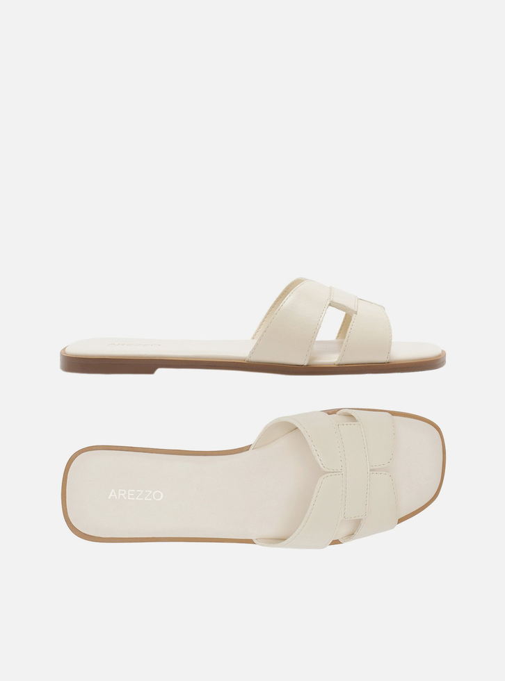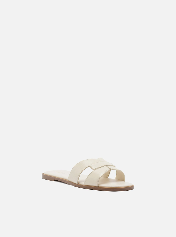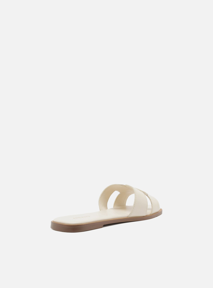 Rasteira off-white. O sapato tem sola flat e ponta quadrada. Traz cabedal em tiras vazadas, além de costuras pesponto por todo o contorno. Com palmilha em couro da cor da sandália e inscrição do nome da marca. Aberta, exibe todo o pé.