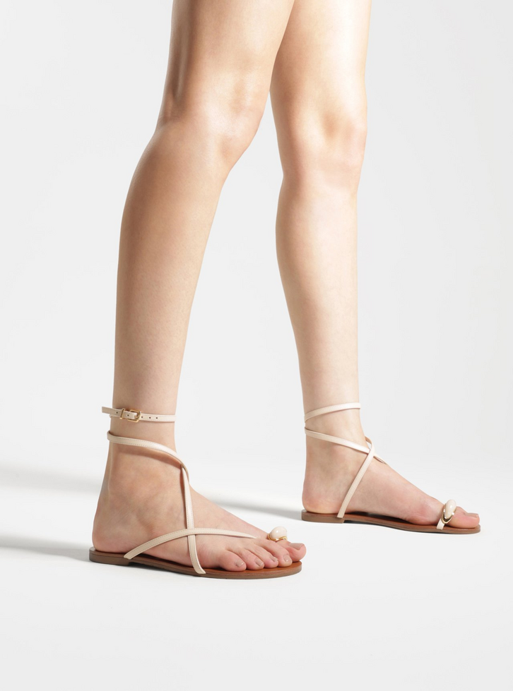 Sandália rasteira feminina off white de couro. O sapato tem salto rasteiro e formato arredondado na ponta. Traz tira fina na parte superior do pé, na diagonal, e tira em torno do dedão com aplicação de metal e pedra. Possui mais duas tiras finas que saem das laterais, cruzam na parte superior do pé, contornam o tornozelo até a perna e fecham em fivela lateral. Com palmilha lisa e nome da marca.