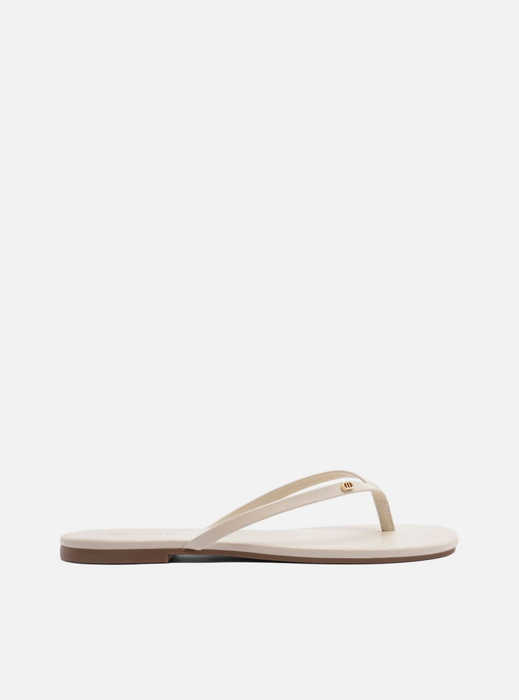 Rasteira off white. O sapato tem sola flat e formato arredondado na ponta. Traz tiras finas dividindo os dedos e detalhe metálico. Com palmilha da cor do sapato e inscrição do nome da marca. Aberta, exibe todo o pé.