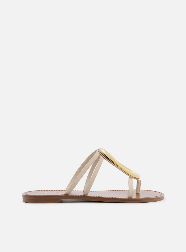 Sandália rasteira dourada. O sapato tem sola flat e formato arredondado na ponta. Traz tiras finas sobre os dedos e na parte superior do pé, unidas por peça metálica orgânica, arredondada e vazada no centro. Com palmilha marrom lisa, contorno em pesponto e inscrição do nome da marca.