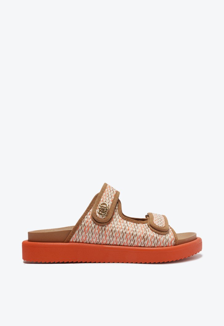 Sandália papete Anacapri marrom e laranja. O modelo tem salto baixo, palmilha marrom com formato anatômico e inscrição do nome da marca. Possui solado flatform, emborrachado e tratorado laranja e bico redondo. Traz cabedal em tecido tramado, fechado nas laterais, e duas tiras largas, uma sobre os dedos e outra no peito do pé com aplicação de pin metálico, ambas com fecho em velcro.