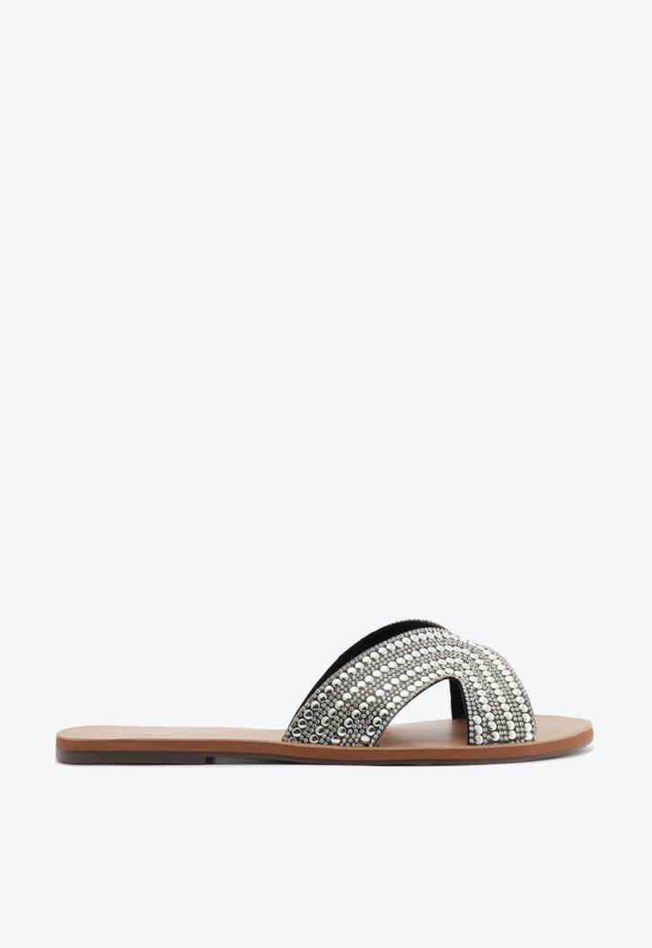Rasteira glam com aplicação de strass, na cor prata. O modelo, que lembra um slider, possui cabedal com recorte imponente vazado: duas tiras largas em manta de brilho com strass, aplicadas sobre a gáspea. Aberta, de bico arredondado, possui solado emborrachado com leve saltinho e palmilha marrom, com assinatura Anacapri. A rasteirinha deixa todo o pé à mostra.