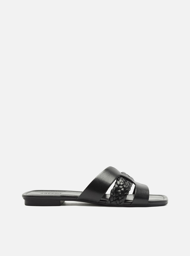 Rasteira preta de couro. O modelo tem sola flat e bico quadrado. Traz cabedal em tiras encaixadas. Aberta, a sandália exibe todo o pé.