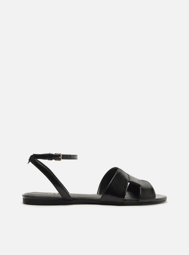 Sandália rasteira preta de couro. O sapato tem sola flat e formato arredondado na ponta. Traz cabedal em tira única e vazada, além de costuras pesponto por todo o contorno. Possui tira fina que sai das laterais, cruza no calcanhar, contorna o tornozelo e fecha em fivela lateral. Com palmilha da cor da sandália e inscrição do nome da marca. Aberta, exibe todo o pé.