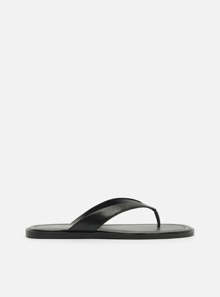 Rasteira preta de couro. O sapato tem sola flat e formato arredondado na ponta. Traz tiras finas dividindo os dedos. Com palmilha lisa, costuras pesponto por todo o contorno e inscrição do nome da marca. Aberta, exibe todo o pé.