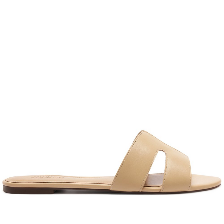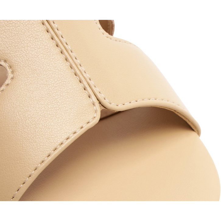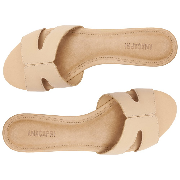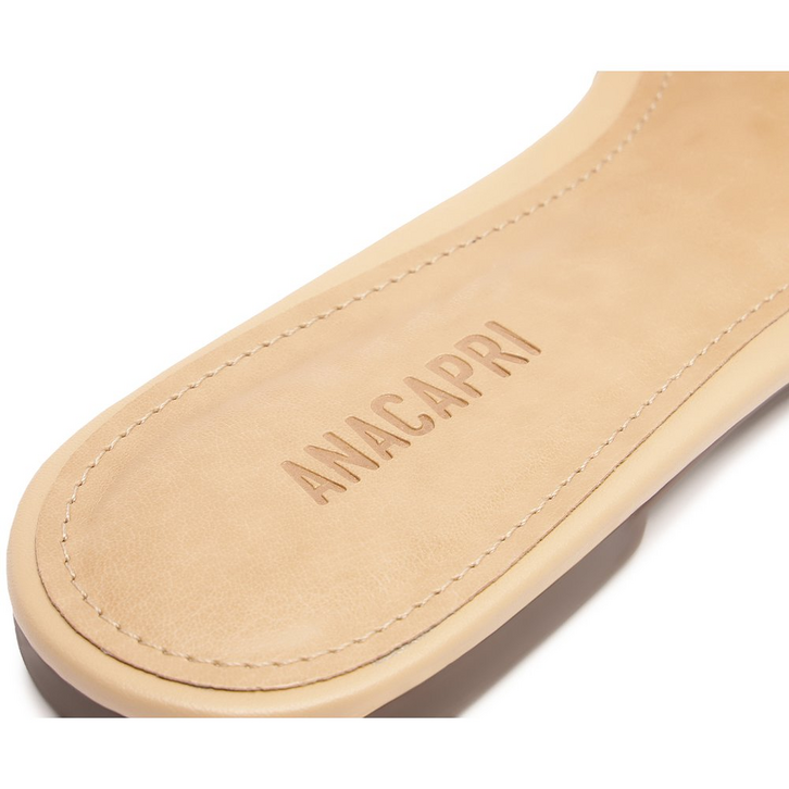 Rasteira com detalhe de recortes e tira em H, na cor bege. A rasteirinha, que lembra um slider, apresenta cabedal em tiras geométricas vazadas: duas tiras largas em material similar ao couro, com efeito envernizado, possui design de recortes em H sobre a gáspea. Aberta, de biqueira redonda, traz palmilha nude contornada em pespontos e assinatura Anacapri. O modelo deixa os dedos e calcanhar totalmente à mostra.