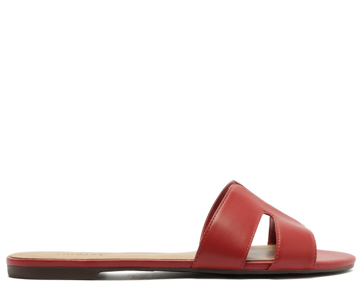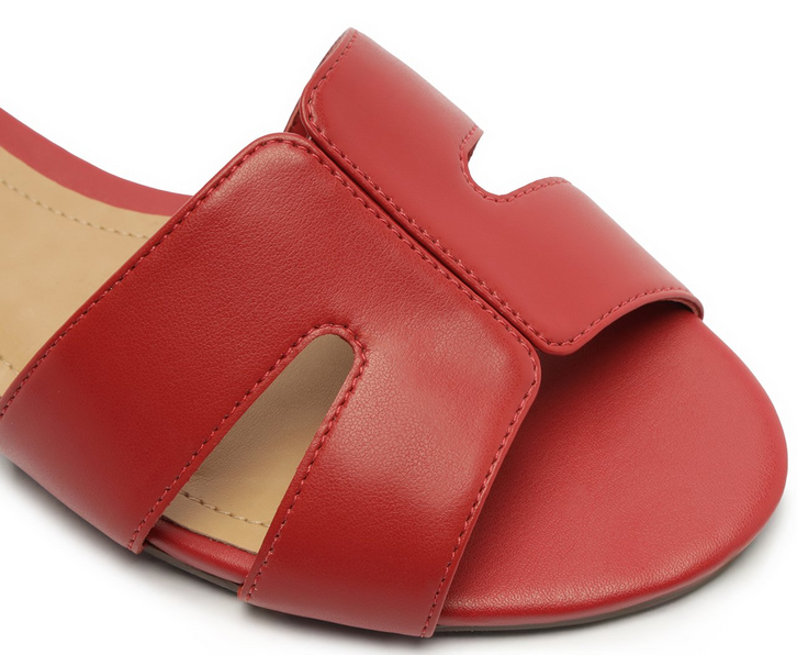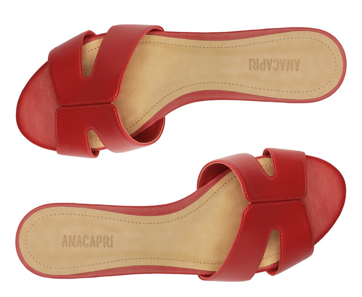 Rasteira com detalhe de recortes e tira em H, na cor vermelha. A rasteirinha, que lembra um slider, apresenta cabedal em tiras geométricas vazadas: duas tiras largas em material similar ao couro, com efeito envernizado, possui design de recortes em H sobre a gáspea. Aberta, de biqueira redonda, traz palmilha nude contornada em pespontos e assinatura Anacapri. O modelo deixa os dedos e calcanhar totalmente à mostra.