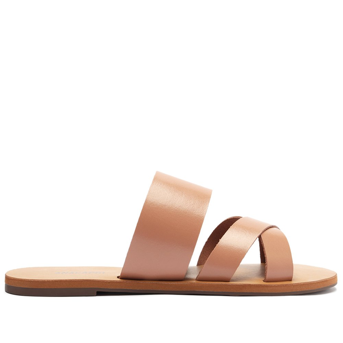 Rasteira em couro com tira tripla. Na cor rosa, possui duas faixas cruzadas finas sobre os dedos, além de uma tira larga no peito do pé. Tem solado marrom com aplicação do nome ANACAPRI na altura do calcanhar.