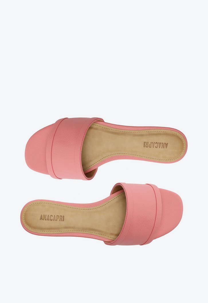 Rasteira flat na cor rosa rosé. A gáspea tem uma tira larga sobre o peito do pé com duas faixas no acabamento. O modelo tem bico quadrado e palmilha com nome da marca. Deixa dedos e calcanhar à mostra.