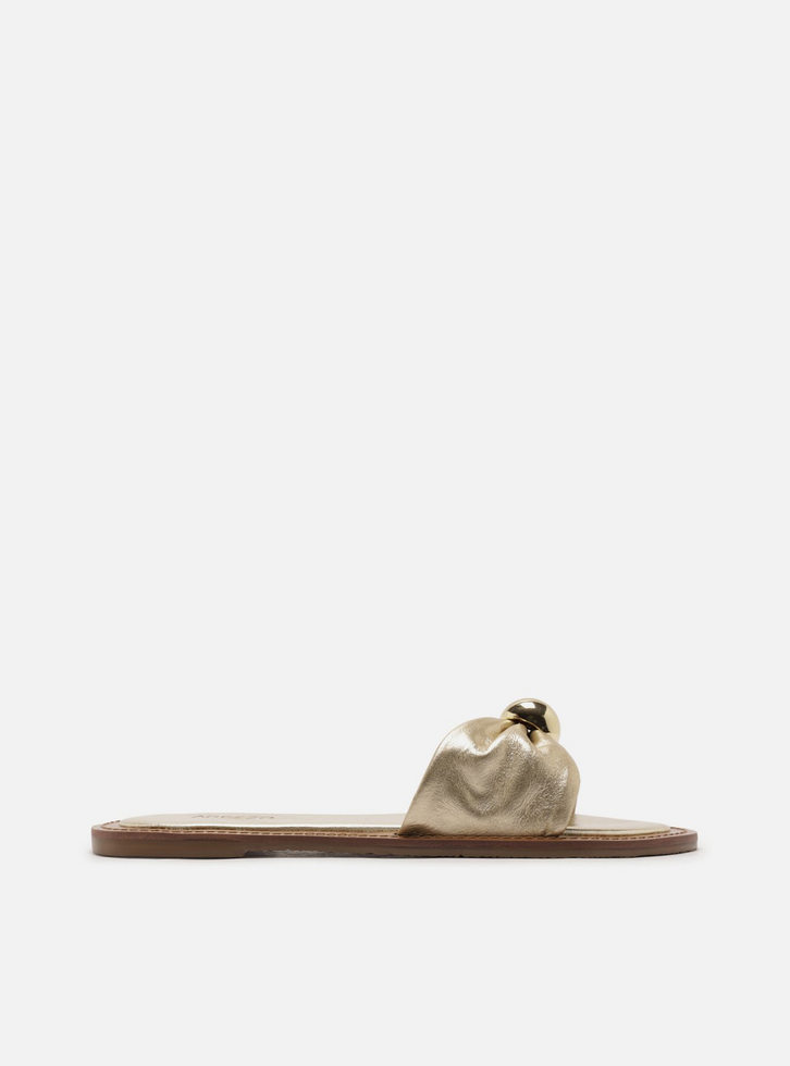 Sandália rasteira dourada em couro. O sapato tem sola flat e formato arredondado na ponta. Traz tira larga sobre os dedos, franzida no centro, com aplicação de esfera metálica dourada. Com palmilha marrom, contorno em pesponto, sobre palmilha e inscrição do nome da marca.