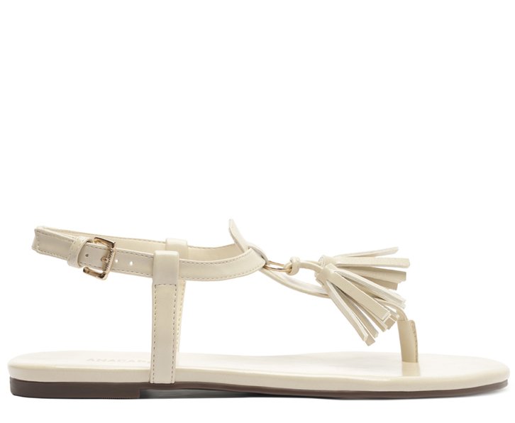 Rasteira slim com detalhe, na cor branca. O modelo possui solado rasteiro emborrachado com leve saltinho e biqueira arredondada. Traz cabedal com tira central com aplicação de barbicachos com franjas que passa entre os dedos, sobe pelo peito do pé. Essa mesma tira central se conecta em tira média traseira presa pelas laterais e contorna o tornozelo, com fecho afivelado lateral, no contorno do calcanhar. Com palmilha comfy na mesma cor da rasteirinha e assinatura Anacapri.
