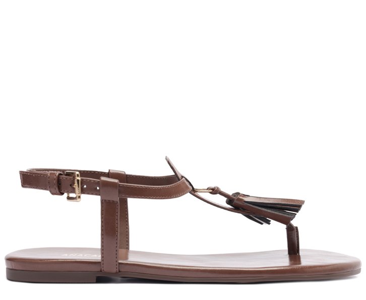 Rasteira slim com detalhe, na cor marrom cinnamon. O modelo possui solado rasteiro emborrachado com leve saltinho e biqueira arredondada. Traz cabedal com tira central com aplicação de barbicachos com franjas que passa entre os dedos, sobe pelo peito do pé. Essa mesma tira central se conecta em tira média traseira presa pelas laterais e contorna o tornozelo, com fecho afivelado lateral, no contorno do calcanhar. Com palmilha comfy na mesma cor da rasteirinha e assinatura Anacapri.