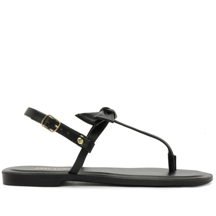 Sandália rasteira slim, com detalhe em laço, na cor preta. O modelo possui solado emborrachado, com leve saltinho traseiro. Apresenta biqueira com shape arredondado e cabedal com tira fina central que passa entre os dedos, que se conecta na tira no peito do pé, com detalhe delicado e imponente em design de meio laço, no arremate central da gáspea. Possui ainda tira fina que contorna o calcanhar com fecho em fivela lateral. Com palmilha confortável no mesmo tom da rasteirinha e assinatura Anacapri.