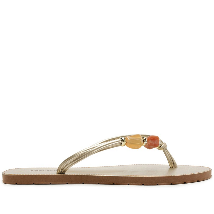 Sandália rasteira dourada, em material similar ao couro. O modelo possui sola flat marrom e biqueira arredondada. O cabedal traz tiras finas em formato de V, dividindo os dedos, com adornos em resina colorida, que mistura tons terrosos e dourados, em uma das tiras. A palmilha dourada apresenta assinatura Anacapri.