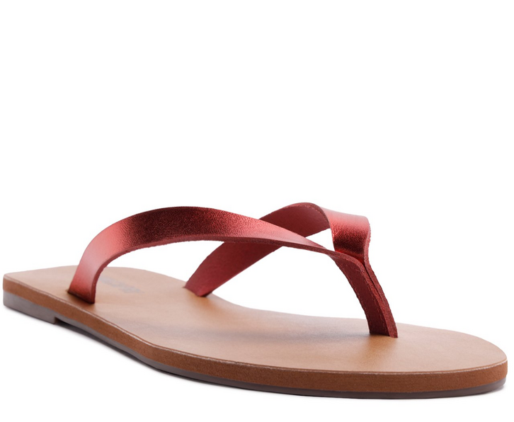 Rasteira slim de couro com tira única, na cor vermelha. O modelo possui solado rasteiro emborrachado com leve saltinho traseiro e biqueira arredondada. Traz cabedal com tira central em couro que passa entre os dedos e segue pelas laterais. Com palmilha comfy nude e assinatura Anacapri.