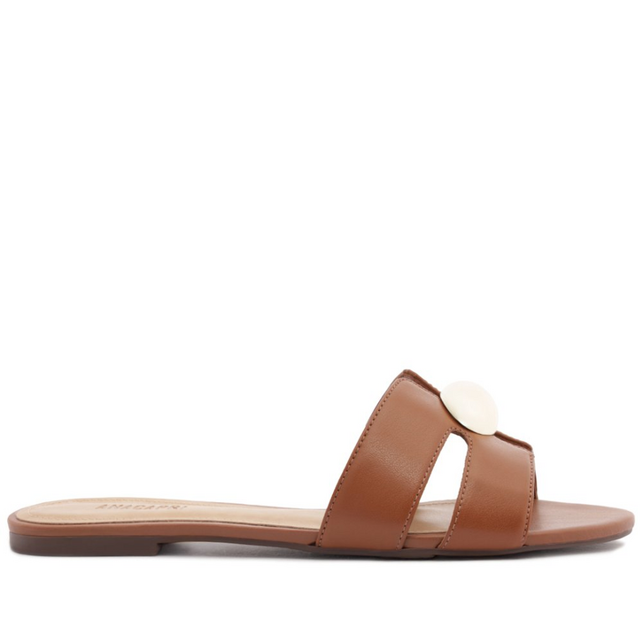 Rasteira de tiras em H, com detalhe de recortes e pedraria, na cor marrom. A rasteirinha, que lembra um slider, apresenta cabedal em tiras geométricas vazadas: duas tiras largas em material similar ao couro, com design de recortes em H e aplicação de maxi pedraria imponente sobre a gáspea. Aberta, de biqueira arredondada, traz palmilha comfy no mesmo tom da rasteirinha, com assinatura Anacapri. O modelo deixa os dedos e calcanhar totalmente à mostra.