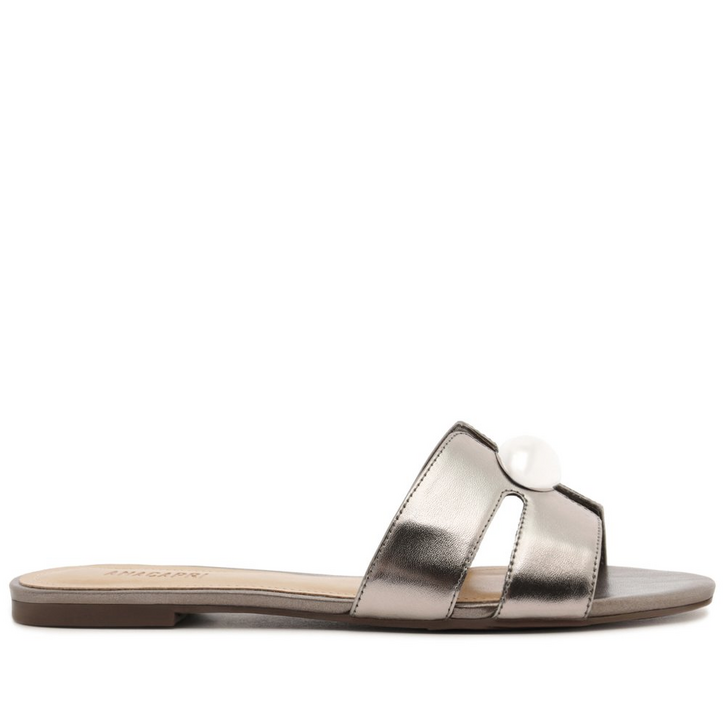 Rasteira de tiras em H, com detalhe de recortes e pedraria, na cor prateada. A rasteirinha, que lembra um slider, apresenta cabedal em tiras geométricas vazadas: duas tiras largas em material similar ao couro, com design de recortes em H e aplicação de maxi pedraria imponente sobre a gáspea. Aberta, de biqueira arredondada, traz palmilha comfy no mesmo tom da rasteirinha, com assinatura Anacapri. O modelo deixa os dedos e calcanhar totalmente à mostra.