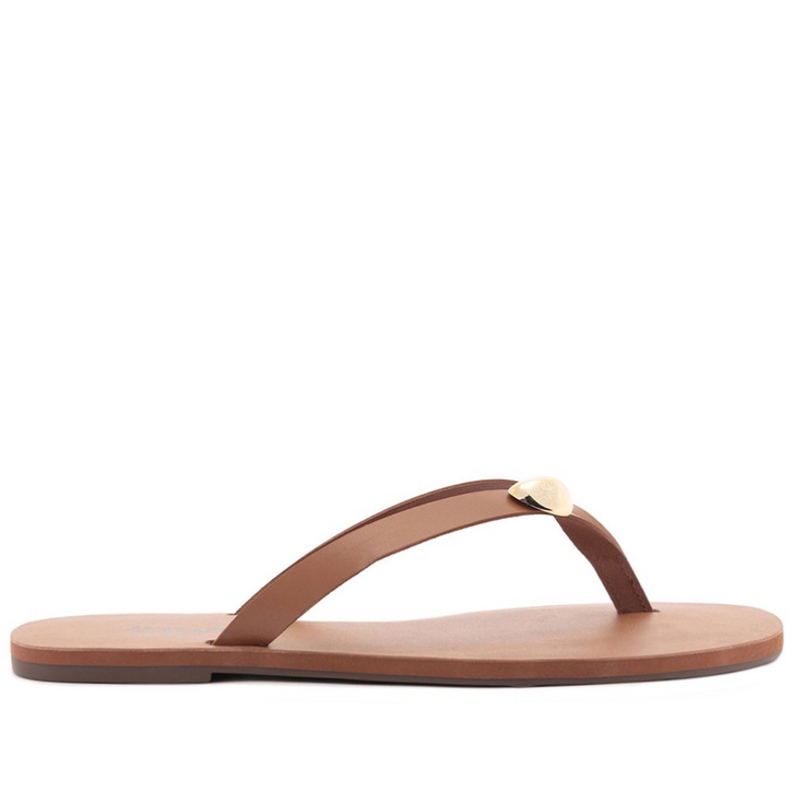 Rasteira marrom em couro. O modelo possui solado rasteiro emborrachado e biqueira arredondada. O cabedal traz tiras finas que se encontram ao centro em formato de V e dividem os dedos, com aplicação de metal discreto em um dos lados. A palmilha nude apresenta assinatura Anacapri.