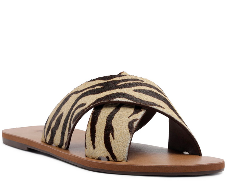 Rasteira Tiras Cruzadas Animal Pint. Rasteirinha de couro animal print com duas tiras grossas na gáspea que se cruzam entre si. Palmilha nude com o nome da marca. Deixa dedos e calcanhar á mostra. Nesse modelo aconselhamos a compra de um tamanho maior do que sua numeração convencional.