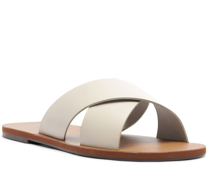 Rasteira Tiras Cruzadas Branca. Rasteirinha de couro branca com duas tiras grossas na gáspea que se cruzam entre si. Palmilha nude com o nome da marca. Deixa dedos e calcanhar á mostra. Nesse modelo aconselhamos a compra de um tamanho maior do que sua numeração convencional.