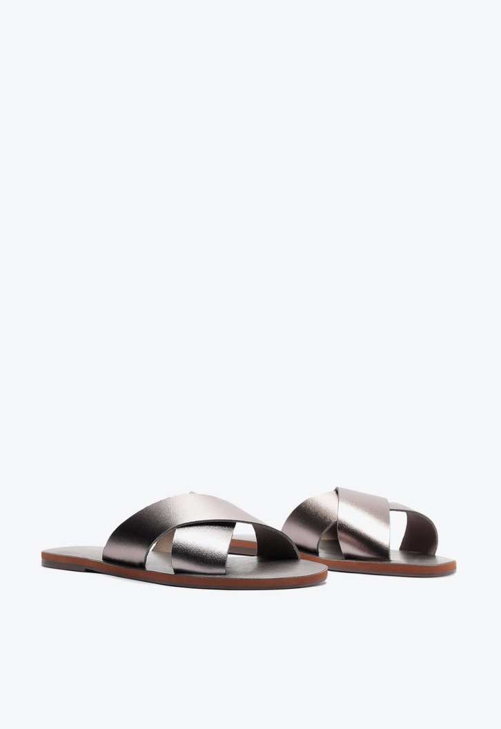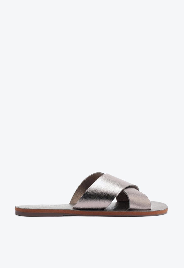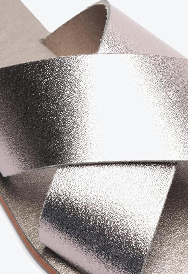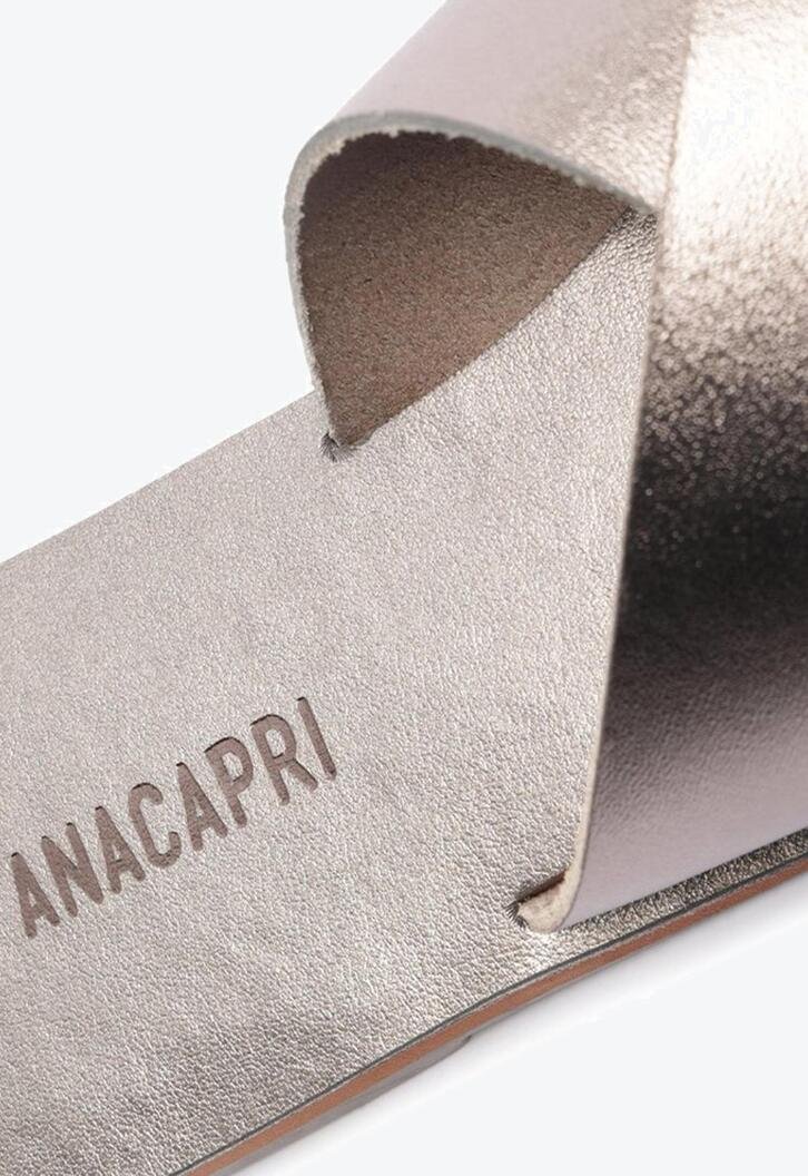 Rasteira Tiras Cruzadas Prateada. Rasteirinha de couro prata com duas tiras grossas na gáspea que se cruzam entre si. Palmilha nude com o nome da marca. Deixa dedos e calcanhar à mostra. Nesse modelo aconselhamos a compra de um tamanho maior do que sua numeração convencional. Porque Apostar: Se você ainda não tem esse modelo de rasteirinha feminina, não sabe o que está perdendo! Ela é versátil e fácil de calçar e nessa versão em couro ainda contamos com uma durabilidade incrível, graças ao seu material mais nobre. Se você se considera minimalista, ela tem tudo pra ser sua queridinha, mas versátil que só ela, funciona super bem na hora de arrematar looks estampados com um calçado mais neutro. Sem erro com ANACAPRI!