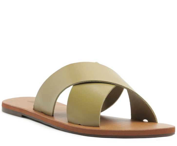 Rasteira Tiras Cruzadas Verde. Rasteirinha de couro verde com duas tiras grossas na gáspea que se cruzam entre si. Palmilha nude com o nome da marca. Deixa dedos e calcanhar á mostra. Nesse modelo aconselhamos a compra de um tamanho maior do que sua numeração convencional.