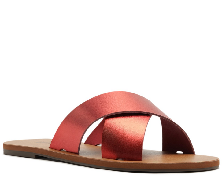 Rasteira Tiras Cruzadas Vermelha. Rasteirinha de couro vermelha com duas tiras grossas na gáspea que se cruzam entre si. Palmilha nude com o nome da marca. Deixa dedos e calcanhar à mostra. Nesse modelo aconselhamos a compra de um tamanho maior do que sua numeração convencional.