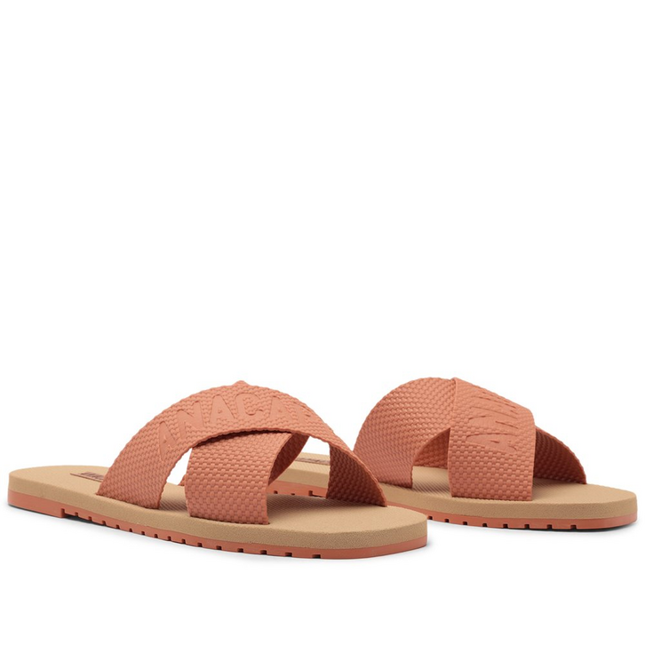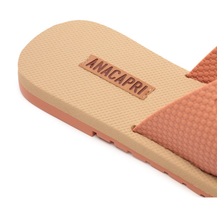 Rasteira Anacapri injetada com tiras cruzadas, na cor bege. O modelo possui cabedal duas tiras largas injetadas com efeito texturizado, que se cruzam sobre o peito do pé, com aplicação da assinatura Anacapri em relevo em uma das tiras. Com solado emborrachado levemente tratorado com detalhe na cor preta, apresenta palmilha nude emborrachada, com assinatura Anacapri. Aberta, ela exibe os dedos e o calcanhar.