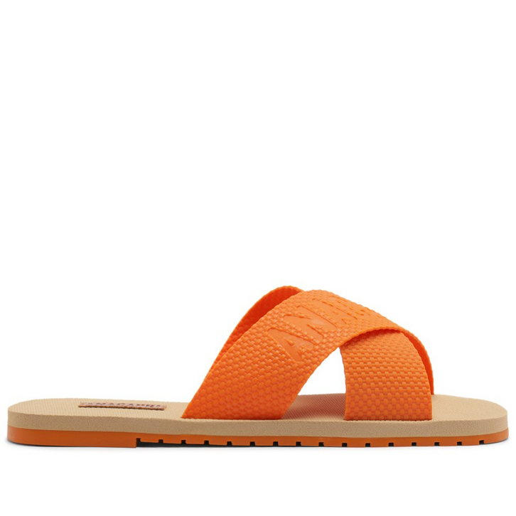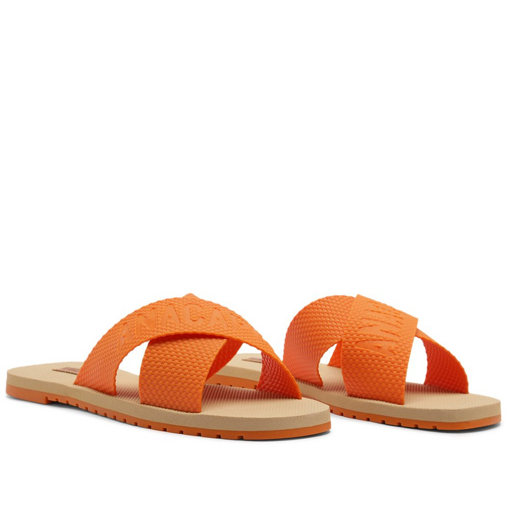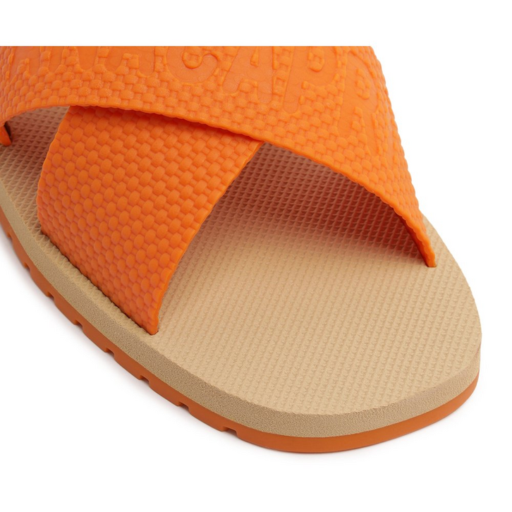 Rasteira Anacapri injetada com tiras cruzadas, na cor laranja. O modelo possui cabedal duas tiras largas injetadas com efeito texturizado, que se cruzam sobre o peito do pé, com aplicação da assinatura Anacapri em relevo em uma das tiras. Com solado emborrachado levemente tratorado com detalhe na cor verde, apresenta palmilha nude emborrachada, com assinatura Anacapri. Aberta, ela exibe os dedos e o calcanhar.