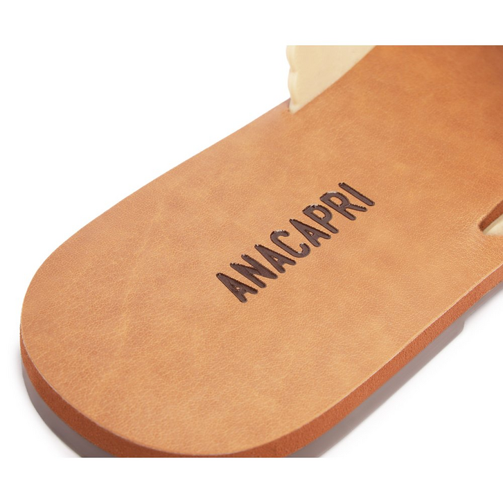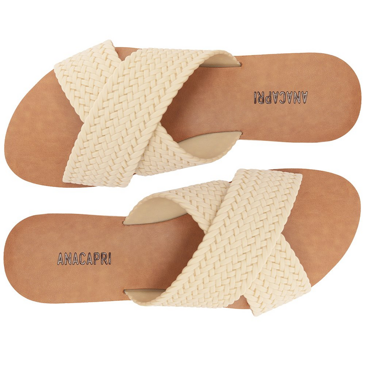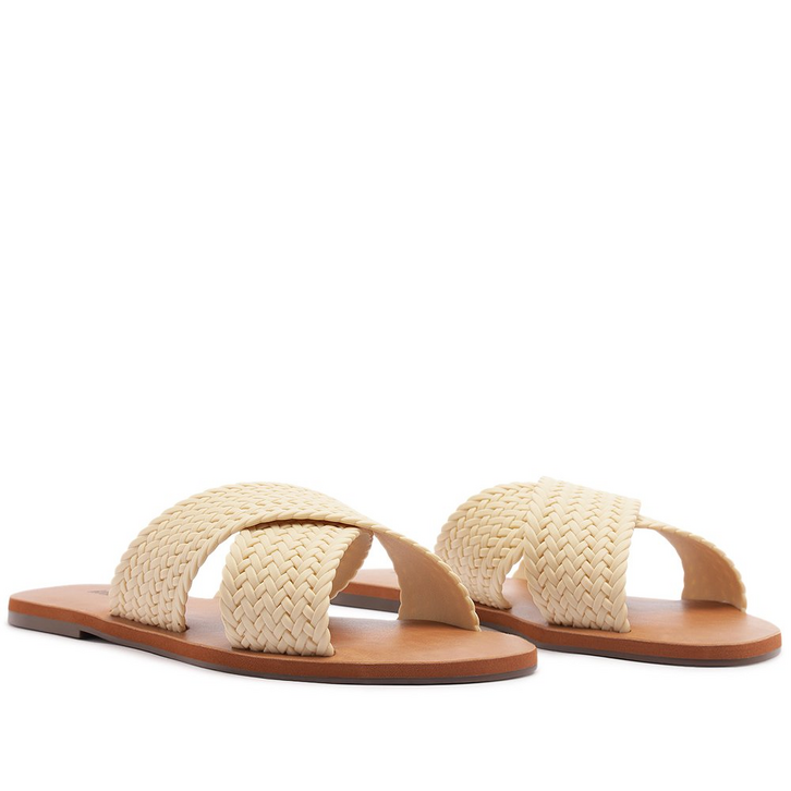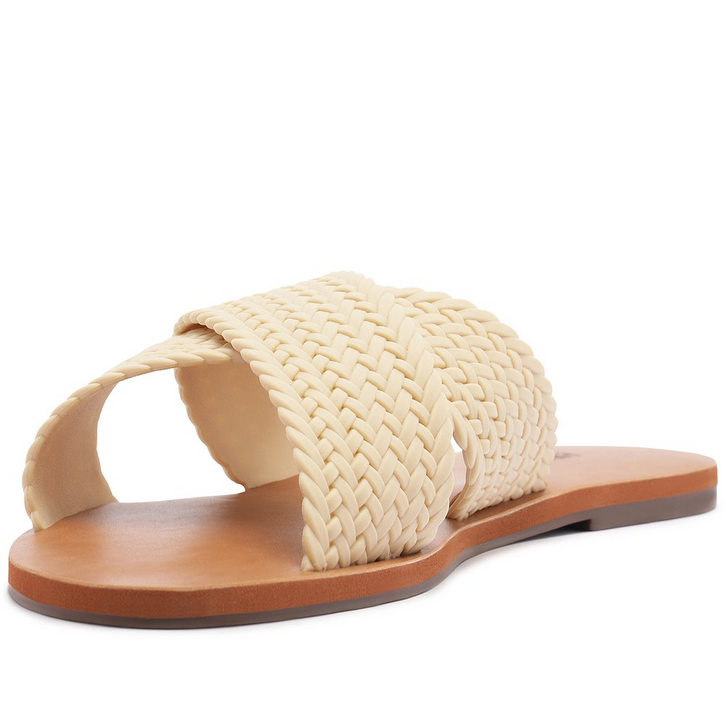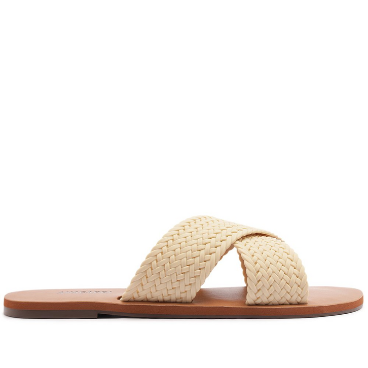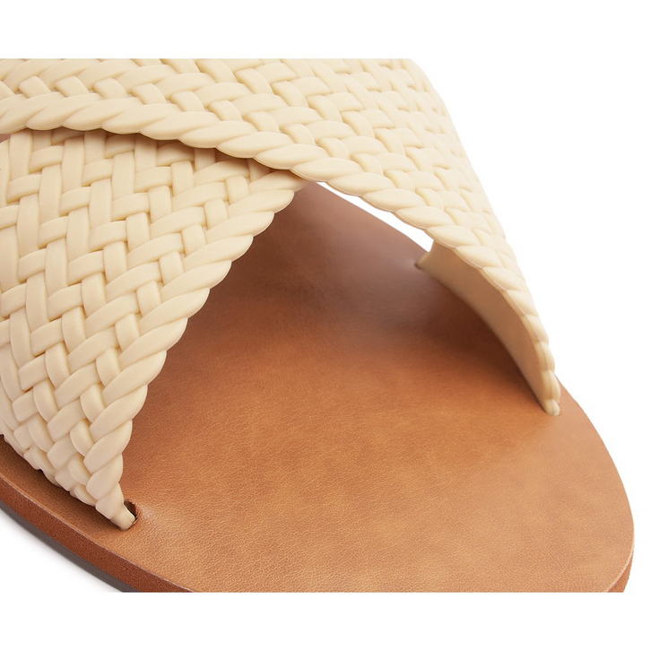 Rasteira Tiras Cruzadas Trançada Bege. Possui duas tiras cruzadas na gáspea com acabamento trançado. Palmilha marrom com o nome da marca, deixa dedos e calcanhar á mostra.