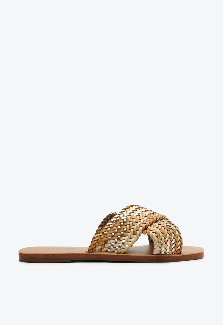Rasteira de tiras cruzadas e trançadas, na cor dourada. O modelo apresenta cabedal em material similar ao couro, com efeito metalizado. De solado rasteiro emborrachado com leve saltinho traseiro e biqueira quadrada, traz duas tiras largas com efeito trançado com detalhe em degradê de tons metalizados - que se cruzam sobre os dedos e peito de pé. Aberta atrás, traz palmilha acolchoada marrom, com assinatura Anacapri.