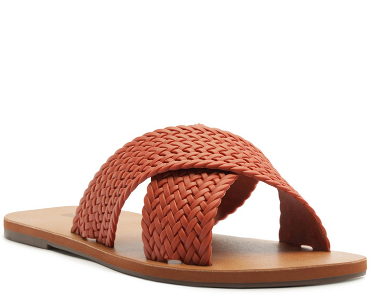 Rasteira Tiras Cruzadas Trançada Laranja. Possui duas tiras cruzadas na gáspea com acabamento trançado. Palmilha marrom com o nome da marca, deixa dedos e calcanhar á mostra.