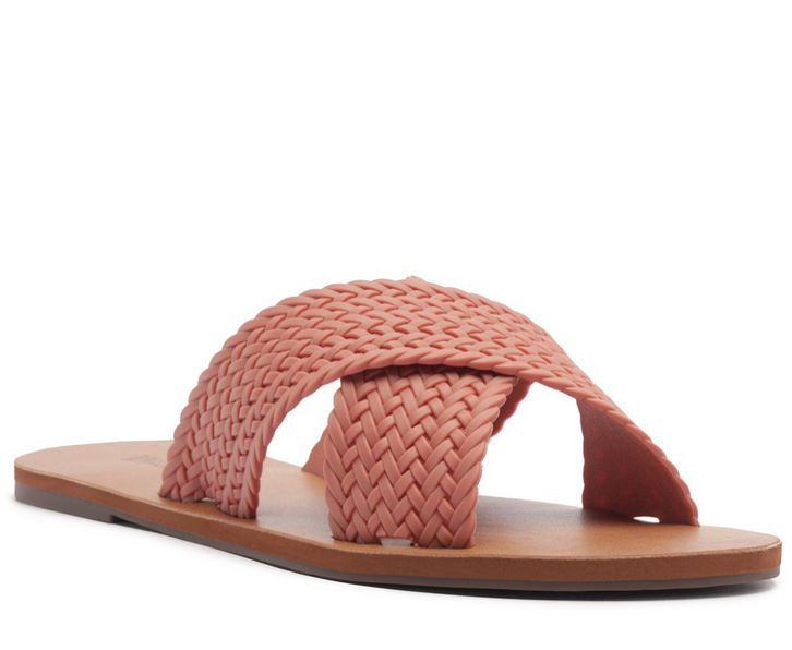 Rasteira Tiras Cruzadas Trançada Rosa. Possui duas tiras cruzadas na gáspea com acabamento trançado. Palmilha marrom com o nome da marca, deixa dedos e calcanhar à mostra.