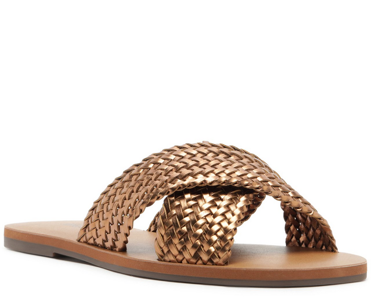 Rasteira de tiras cruzadas em tressê, na cor bronze. O modelo de material similar ao couro possui solado rasteiro com leve saltinho, com biqueira quadrada. Apresenta duas tiras mais largas com acabamento em tressê trançadas no cabedal - que se cruzam sobre os dedos e no peito de pé. Traz palmilha marrom, com assinatura Anacapri. Aberta, a rasteirinha deixa os dedos e calcanhar totalmente á mostra.