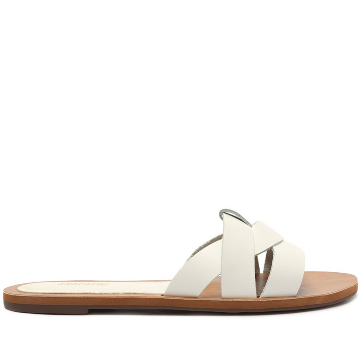 Rasteira de couro com tiras entrelaçadas, na cor branca. O modelo flat, traz solado emborrachado com leve saltinho traseiro e biqueira arredondada. Possui cabedal com tiras sobre os dedos, que se entrelaçam e se conectam ao centro com design moderno. Aberta atrás, a rasteirinha apresenta palmilha nude - com detalhe comfy e emborrachado - com assinatura Anacapri.